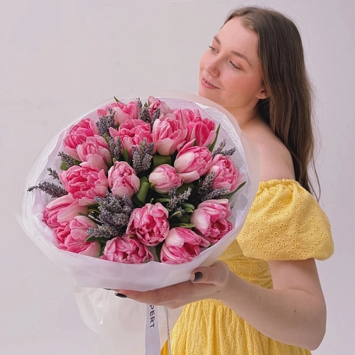 «LAVENDER DREAM» — букет из 19 пионовидных тюльпанов с веточками лаванды. Мягкий розово-лиловый микс создаёт гармоничное сочетание цвета и формы, где каждый элемент подчёркивает красоту другого. Композиция выглядит изящно и свежо, становясь идеальным подарком для выражения внимания и тёплых чувств.