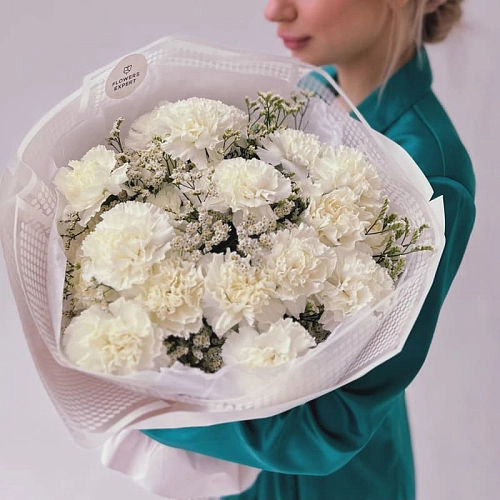 Букет «LIGHT SAND» — нежная композиция из 19 пушистых белых гвоздик, дополненных воздушным лимониумом. Легкий и утончённый, он символизирует чистоту, спокойствие и искренние чувства. Идеален для любого повода — от признания в любви до благодарности.