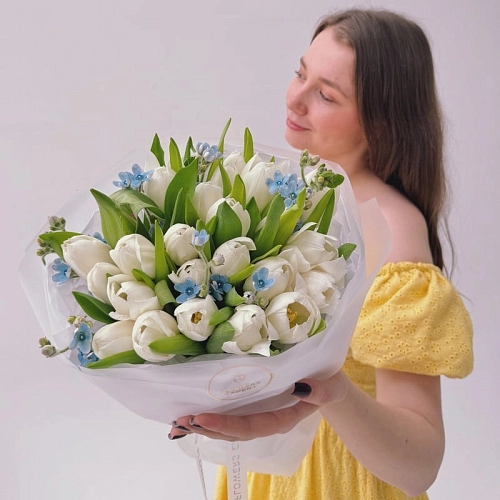 «ARCTIC BLOOM» — изысканный букет из 25 белых тюльпанов, дополненных нежным оксипеталумом. Гармоничное сочетание форм и оттенков создаёт свежий и утончённый образ, наполняя композицию лёгкостью и элегантностью. Этот букет станет прекрасным подарком, позволяя выразить внимание, заботу и тёплые чувства в любой особенный день.