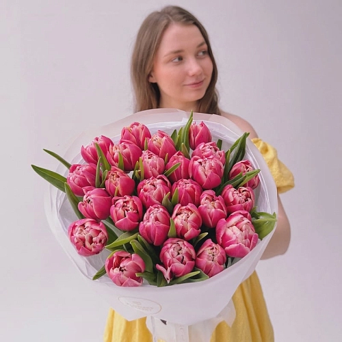 «COLUMBUS» — элегантный букет из 25 пионовидных тюльпанов с насыщенными оттенками, создающий гармоничную и выразительную композицию. Пышные и аккуратные бутоны делают букет ярким и живым подарком, способным передать внимание, искренние чувства и тёплые эмоции, оставляя незабываемое впечатление.