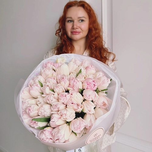 «FOXTROT» — элегантный букет из 51 пионовидного тюльпана с нежными оттенками. Пышные и аккуратные бутоны создают гармоничную и объёмную композицию, наполняя её свежестью и утончённой красотой. Этот букет станет эффектным подарком, способным передать внимание, искренние эмоции и тёплые чувства, делая момент особенно запоминающимся.