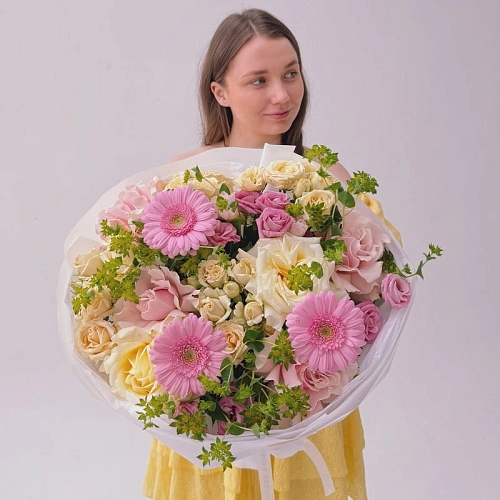 «SPRING SUN» — яркий и нежный букет с кустовыми розами, герберами и буплерумом. Сочетание насыщенных и мягких оттенков создаёт свежий, жизнерадостный образ, а гармония форм и текстур придаёт композиции особую лёгкость. Этот букет станет прекрасным подарком, способным выразить внимание, заботу и тёплые искренние чувства.