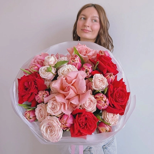 Букет с розами и тюльпанами "SPRING RED GLOW"