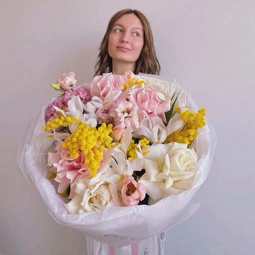 Букет с розами, ирисами и мимозой "SPRING AURORA"