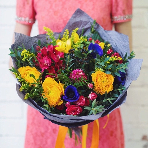В составе букета: ярко-желтые ранункулюсы, красные розы, черные ягоды вибурнума, анемоны насыщенно-синего цвета, розовая фрезия, сочная зелень. И все это яркое разнообразие великолепно оттенено жатым фиолетовым крафтом.
