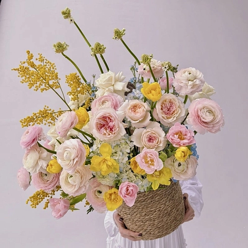 Композиция в кашпо c пионовидными розами, ранункулюсами и тюльпанами "VEIL"
