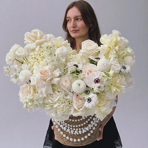 Композиция в кашпо c жемчугом, гортензиями и анемонами "WHITE GRACE"