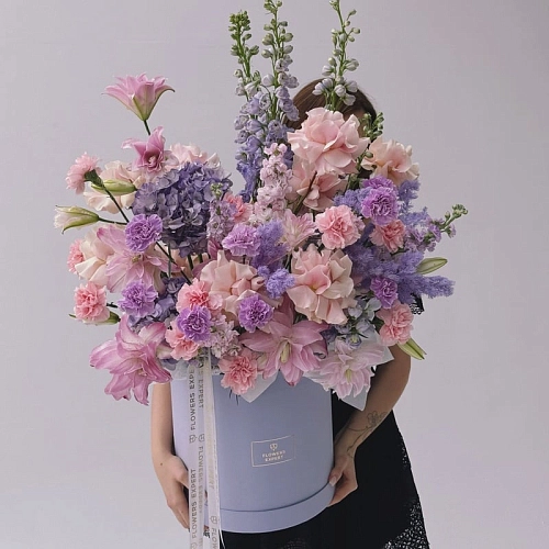 Коробка с дельфиниумом и пионовидными лилиями "AMOUR VIOLET"