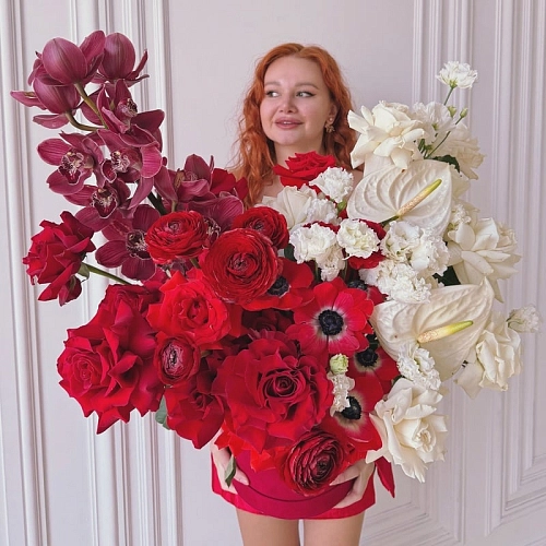 «RED IVORY» — эффектная коробка с орхидеей, анемонами, розами и антуриумом в изысканных белых и насыщенных красных оттенках. Каждая деталь композиции гармонично подчёркивает форму и цвет, создавая элегантный и выразительный образ. Этот букет станет ярким и трогательным подарком, способным передать внимание, любовь и тёплые эмоции.