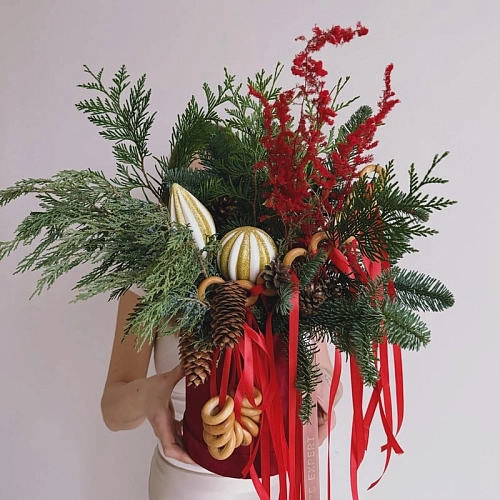 «RUSKI» — это тёплая и душевная новогодняя композиция, вдохновлённая русскими традициями и атмосферой домашнего праздника. Ароматная хвоя гармонично сочетается с сушками, создавая ощущение уюта, гостеприимства и настоящего зимнего застолья. Натуральные элементы и характерный декор придают композиции особый характер и самобытность.