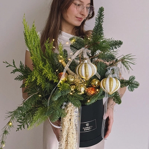 «HOLIDAY SPARKLE» — это изысканная праздничная композиция, наполненная светом и утончённым блеском. Элегантный жемчуг придаёт композиции нежность и роскошь, а гирлянда добавляет мягкое мерцание, создавая ощущение волшебного зимнего вечера. Хвойные ветви и декоративные элементы гармонично дополняют образ, делая его стильным и праздничным.