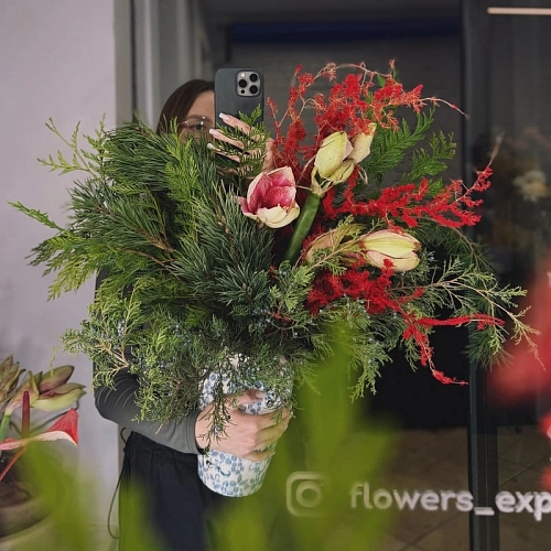 Зимняя композиция, созданная в мягкой роскошной палитре, объединяет насыщенно-красные амариллисы и богатую фактурную хвою — можжевельник, сосну, тую, кедр и воздушный аспарагус. Эти природные элементы формируют тёплый праздничный образ, наполненный уютом, глубиной и дыханием зимнего леса.