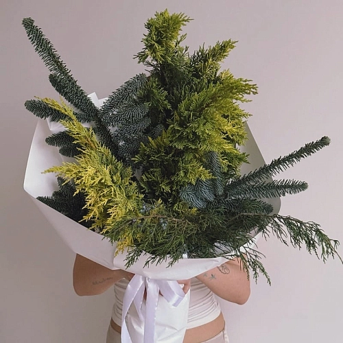 «FOREST WHISPER» — это ароматный зимний букет, в котором сочетаются различные виды хвои, создавая богатую текстуру и ощущение свежести лесного воздуха. Разнообразие оттенков зелени придаёт композиции глубину, естественность и праздничный шарм.